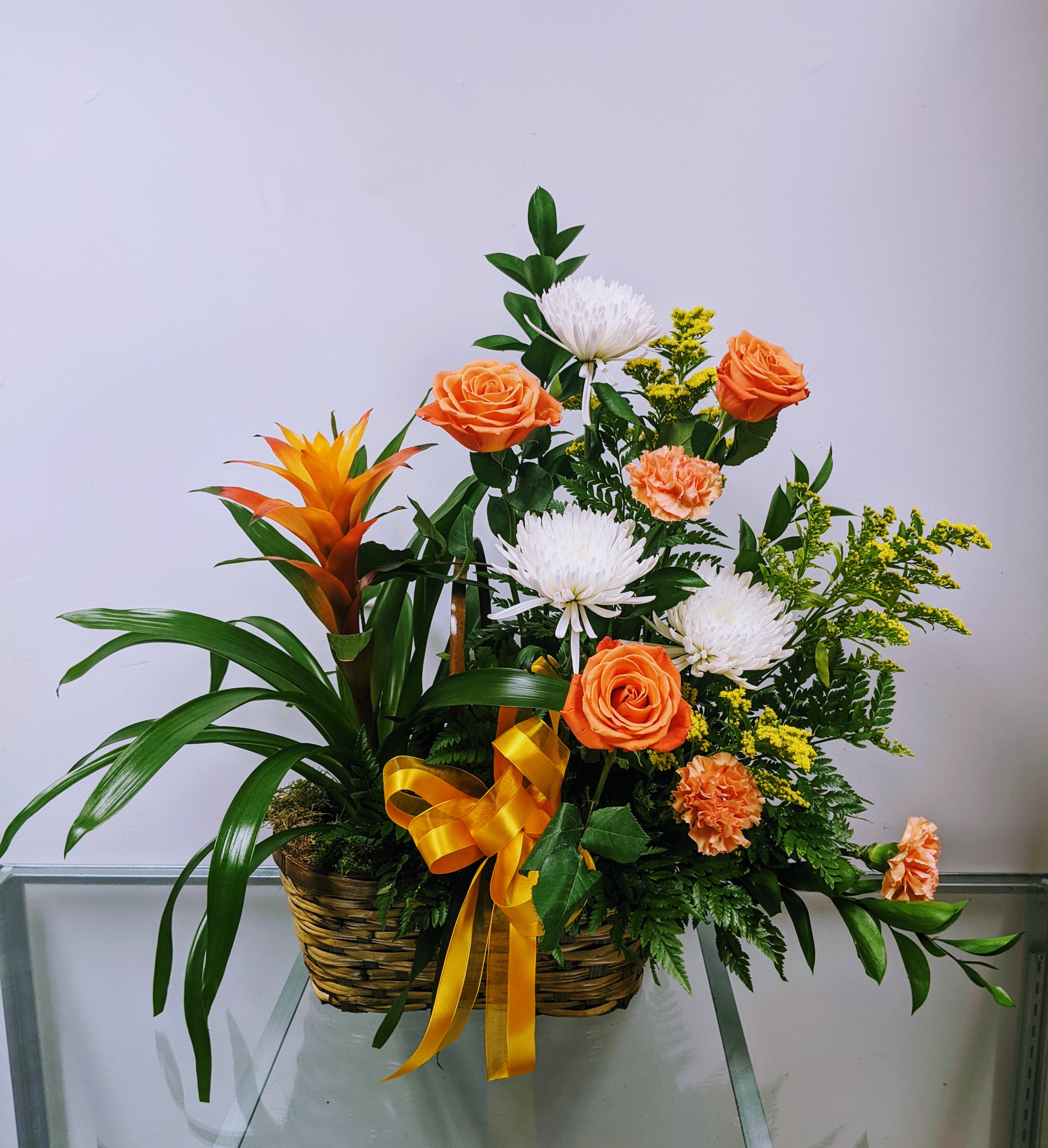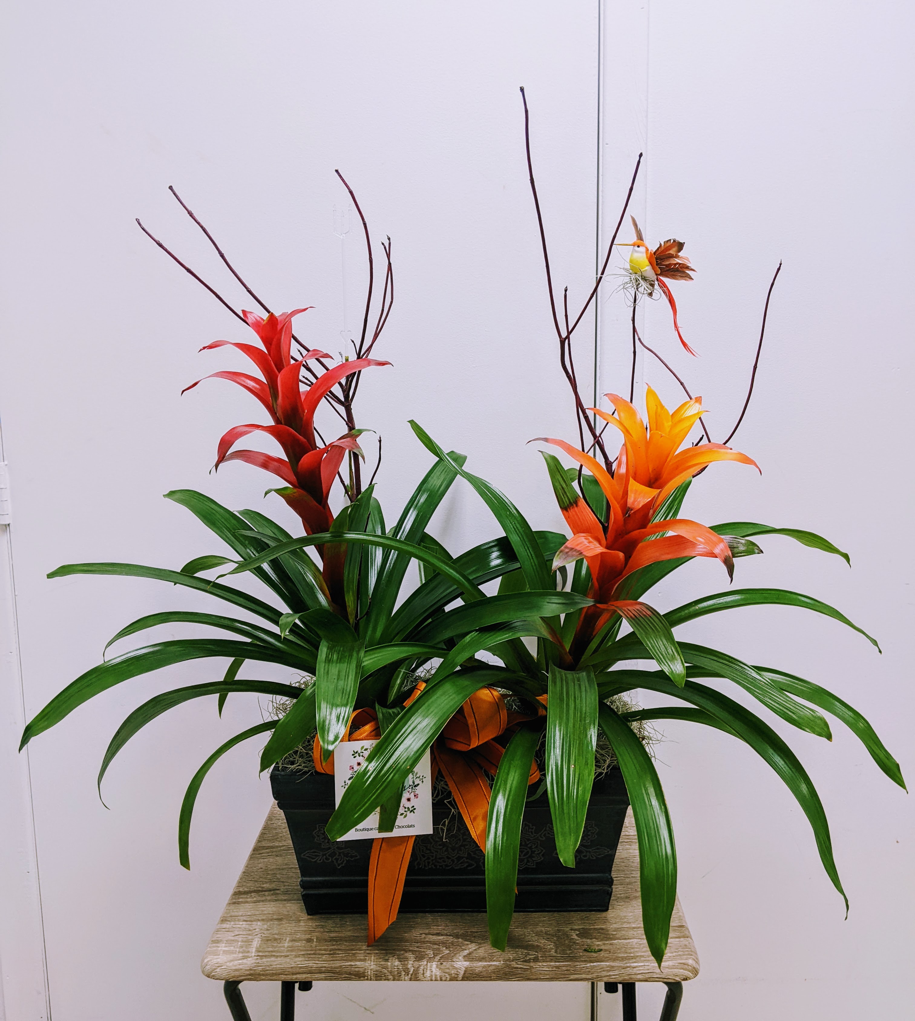 2 plantes / oiseau du paradis et bromélia / dans un panier fleuri